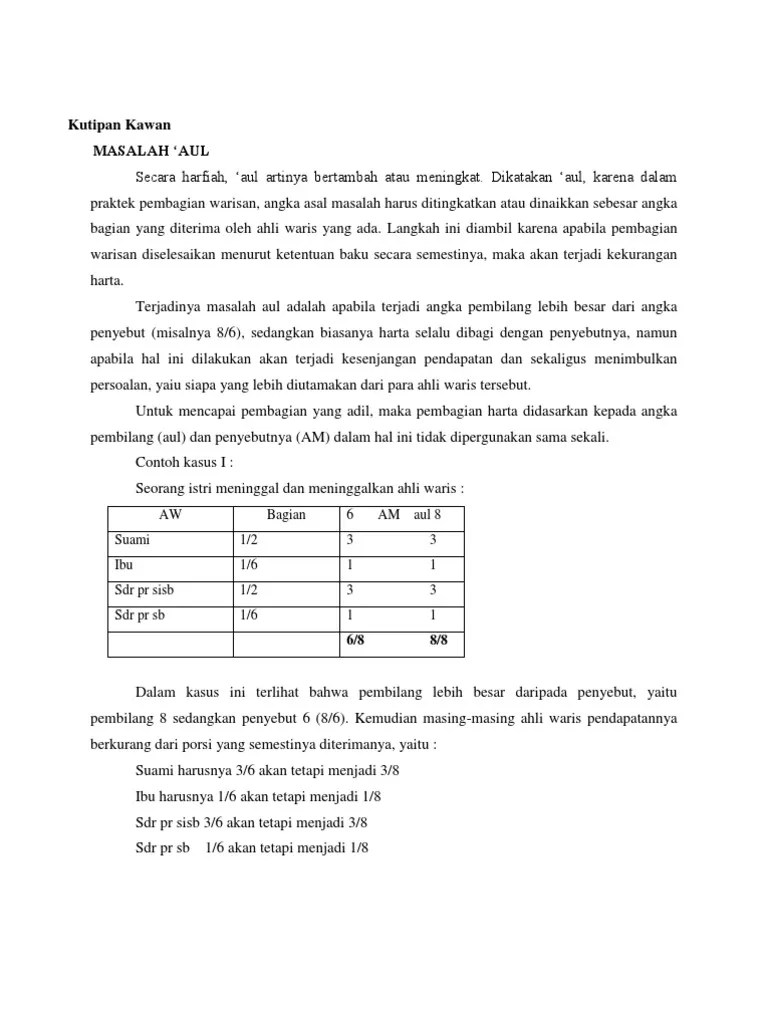 Salah satu contoh sistem hukum kewarisan islam klasik yang. Hanifah berpendapat, dzawil arham lebih berhak dari baitul mal. Contoh lain, seseorang wafat dan meninggalkan istri, ibu, . Perhitungan pembagian kewarisan bagi ahli waris yang mempunyai kasus. Kasus ini diibaratkan pewaris meninggalkan.