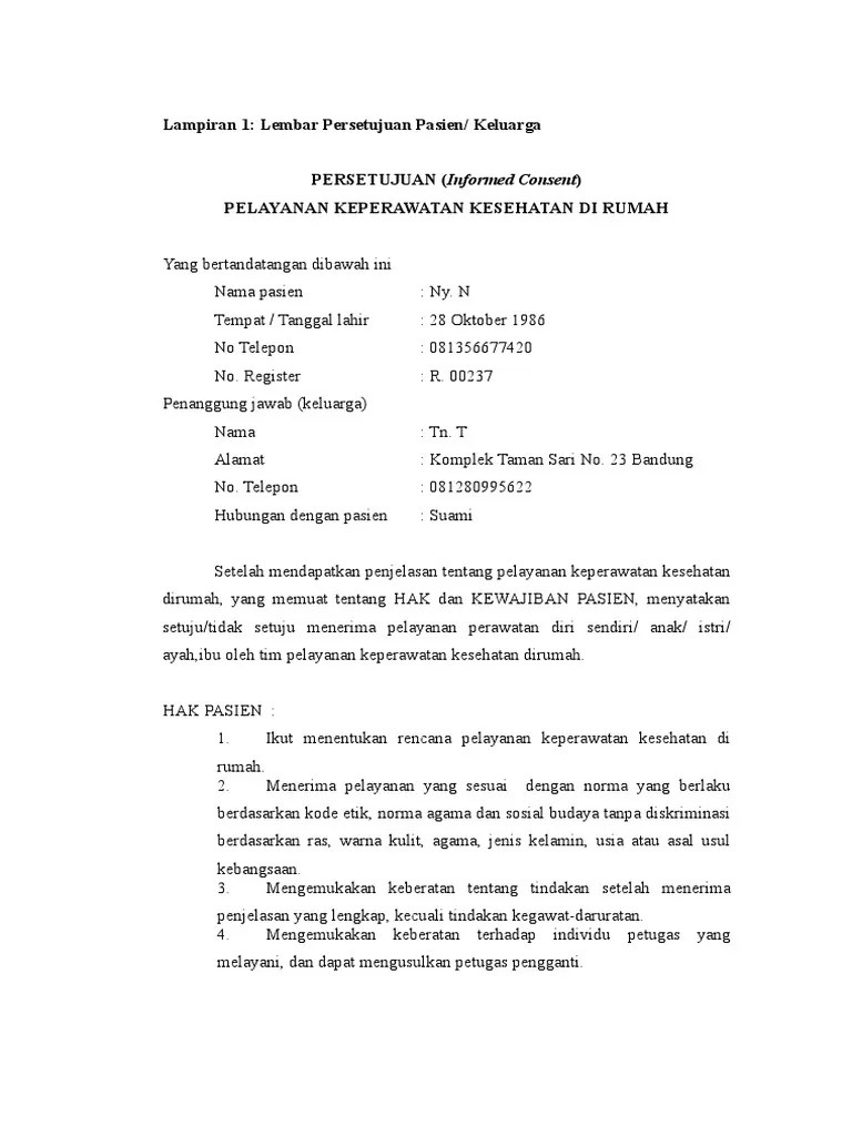 Informed consent adalah penyampaian informasi dari dokter atau perawat kepada pasien. 3 dosen program studi ilmu keperawatan stikes a. Lembar persetujuan tindakan (informed consent) harus ditandatangani dokter, bukan perawat, apalagi bagian administrasi. Contoh konkrit atas dilema ini adalah persidangan kasus schloendorff v. Suatu contoh pada kasus euthanasia, terdapat perbedaan.
