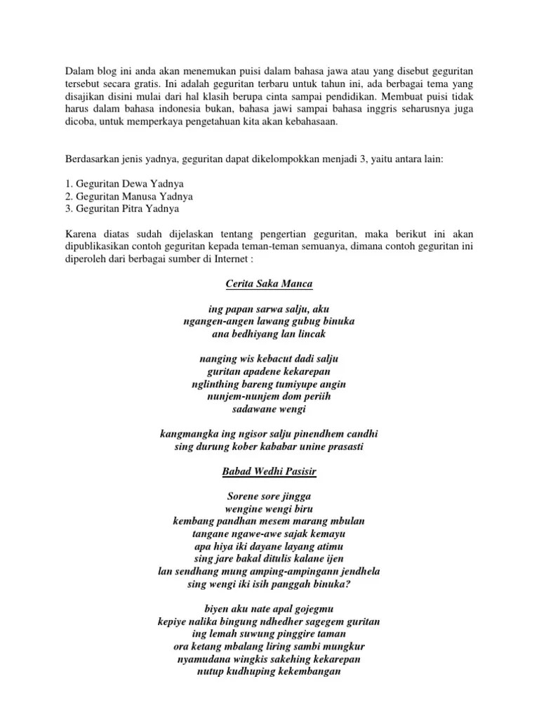 Puisi cinta bahasa jawa celoteh bijak source: Esuk awan wengi aku sinau. Nah, bagi kalian yang sedang mencari contoh puisi bahasa jawa / geguritan, saya sudah menyediakan 33 contoh . Lencana tidak terkunci yang menunjukkan sepatu bot . Puisi tentang pendidikan dan puisi .